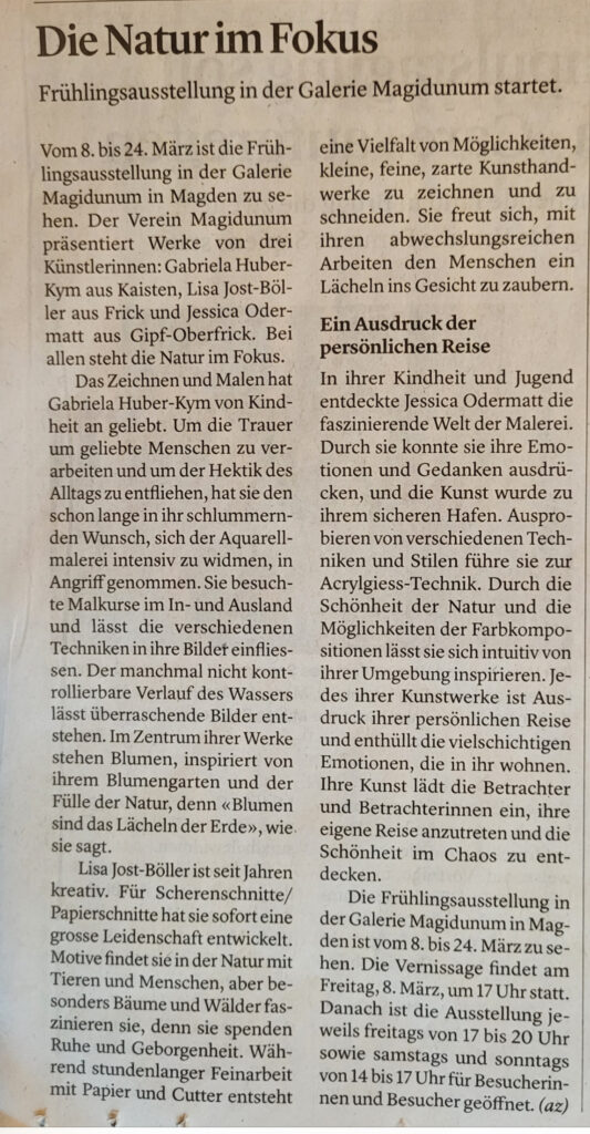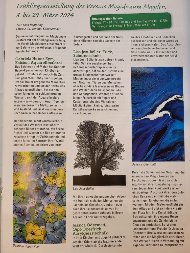 Vom 8. bis 24. März ist die Frühlingsausstellung in der Galerie Magidunum in Magden zu sehen. Der Verein Magidunum präsentiert Werke von drei Künstlerinnen: Gabriela Huber-Kym aus Kaisten, Lisa Jost-Böller aus Frick und Jessica Odermatt aus Gipf-Oberfrick. Bei